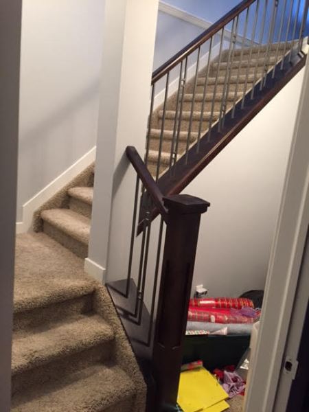 The 2nd image is an older 3D CAD rendering view from the final design. At the bottom of the steps, notice that the support post holding the I-beam is now the center of the two archways and the existing stairway walls and door (3rd image During Construction) are removed as shown under construction framing.